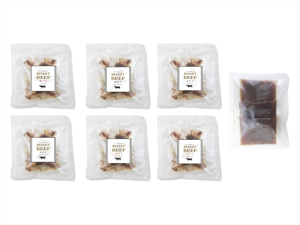 ●内容:神戸牛ローストビーフ・松阪牛ローストビーフ・近江牛ローストビーフ・米沢牛ローストビーフ・仙台牛ローストビーフ・宮崎牛ローストビーフ 各50g×1個 オニオンソース40g×3個