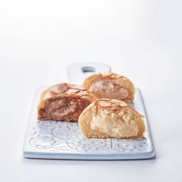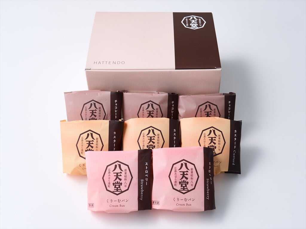 昭和8年創業、広島県三原市の八天堂が手掛ける看板商品『くりーむパン』。ふんわりとしたパンに、なめらかなクリームをたっぷり詰め込み、冷やして食べることでとろける食感を楽しめます。カスタード・チョコレート・ストロベリーの3種をアソート