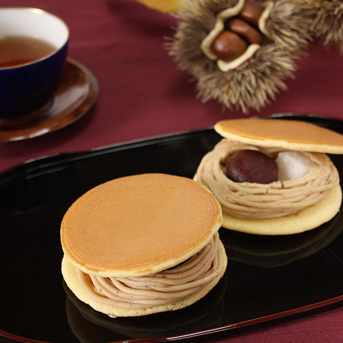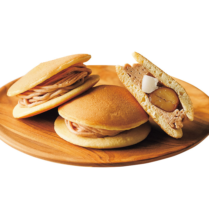 ふんわりとした生地に、風味豊かなモンブラン餡と渋皮付きの一粒栗、やわらかな求肥餅を挟み込んだ創作どら焼きです。和と洋の美味しさが調和した贅沢な味わいをお楽しみいただけます。